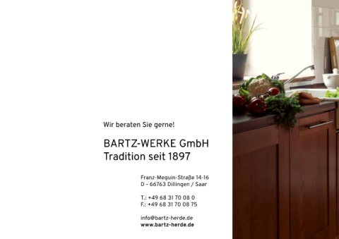 Wir beraten Sie gerne! BARTZ-WERKE GmbH Tradition seit 1897 Franz-Meguin-Straße 14-16 D - 66763 Dillingen / Saar T.: +49 68 31 70 08 0 F.: +49 68 31 70 08 75 info@bartz-herde.de www.bartz-herde.de